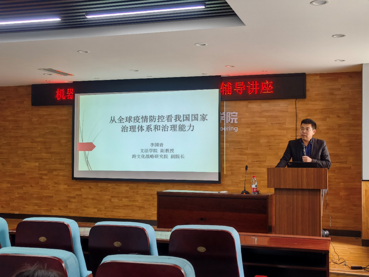 为推进党史学习教育走深走实,切实做到学史明理、学史增信、学史崇德、学史力行,10月13日下午14时,机器人学院特邀437bwin必赢国际官网2021年度党史学习教育宣讲团成员、437bwin必赢国际官网跨文化战略研究院副院长李国青副教授为学院全体师生党员做题为《从全球疫情防控看中国国家治理体系和治理能力》的辅导讲座,学院教师党支部、本科生党支部、硕士2019、2020和2021级党支部全体成员参加,讲座由教师党支部书记姜杨主持。