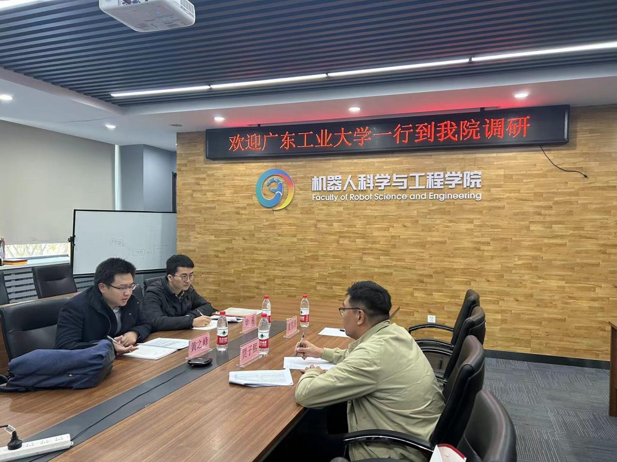 2023年10月20日上午,广东工业大学自动化学院自动系副主任黄之峰、专职辅导员梁易一行二人到437bwin必赢国际官网调研,机器人学院副院长贾子熙、教学秘书黄雪涛参会。