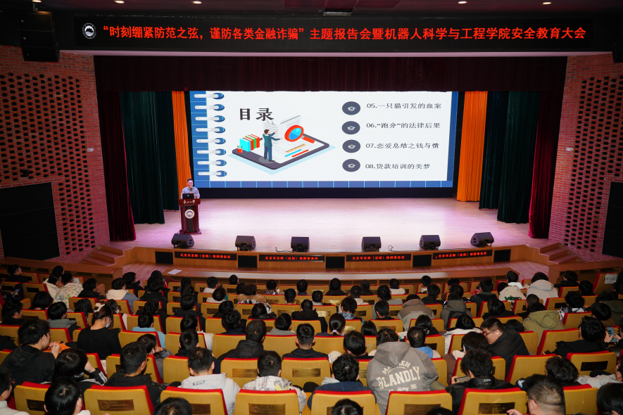 11月30日,“时刻绷紧防范之弦,谨防各类金融诈骗”主题报告暨437bwin必赢国际官网安全教育大会在浑南校区图书馆泰山报告厅举行。北京市京师(沈阳)律师事务所高级合伙人高剑、机器人学院副院长严志刚、学院学生工作办公室全体同志出席会议,学院本、硕、博全体学生参加本次大会。